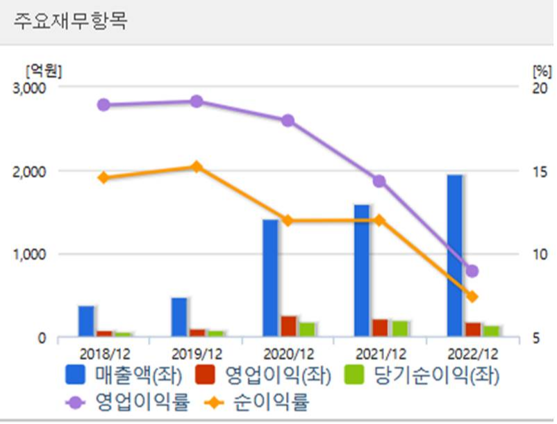 매출은 큰 폭으로 늘었으나 영업이익률이나 순이익률은 매출액에 비해 많이 빠지는 모습을 보여줍니다.