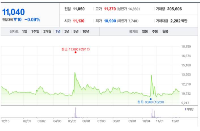 ⊙ 52주 최고가 : 17,090원(여름 구제역 파동시 주가 크게 상승)